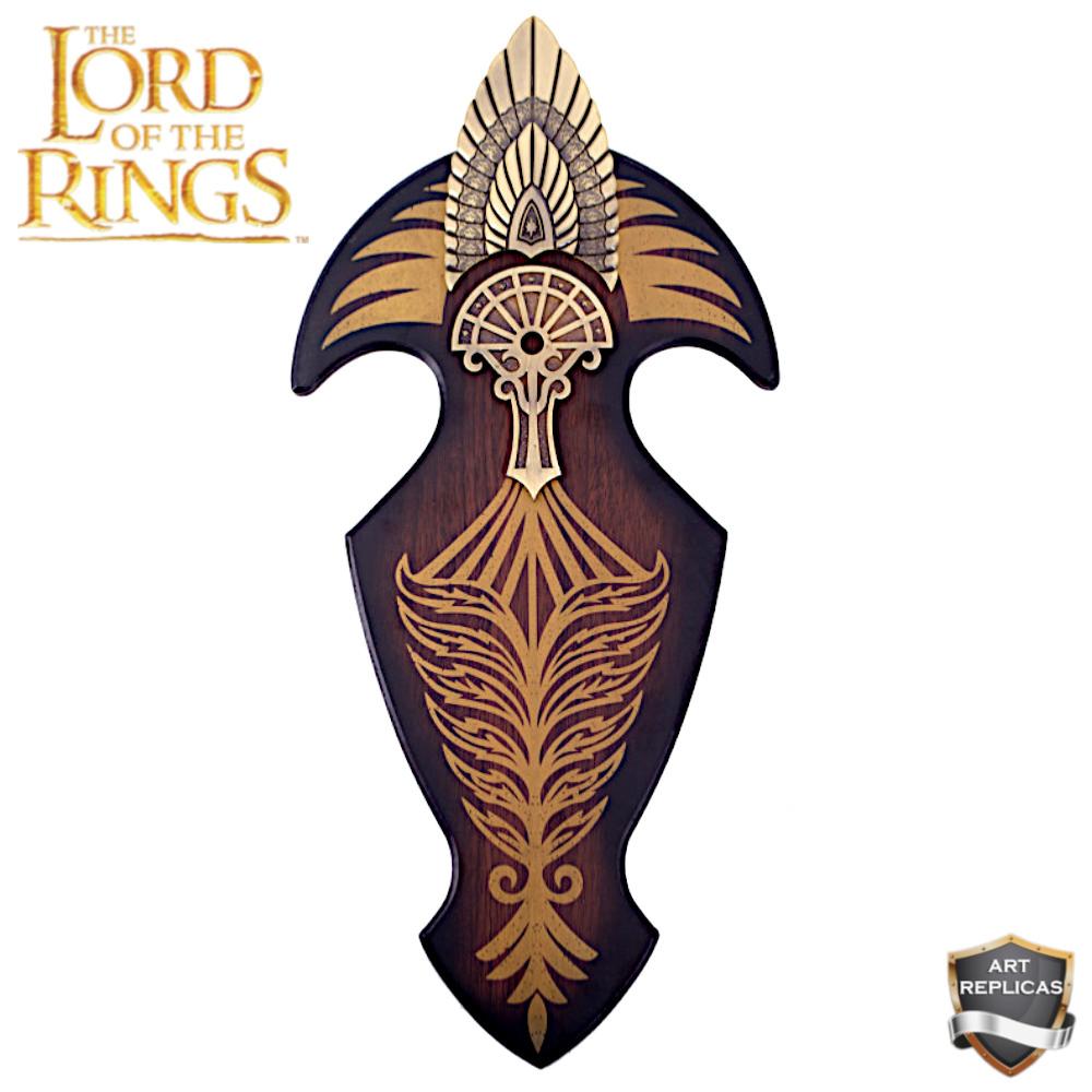 - Très Grande Plaque de présentation murale en bois décoré, avec le symbole du royaume de Gondor en métal doré et sur le dessus la couronne du roi en métal doré !